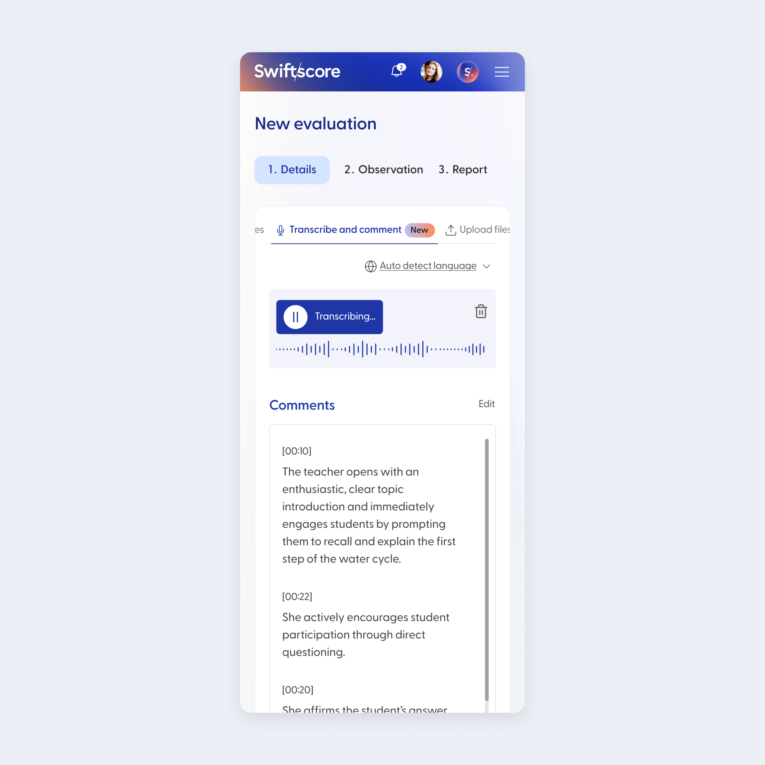 Upload text notes, an audio recording, or any file from an observation session to begin an evaluation.